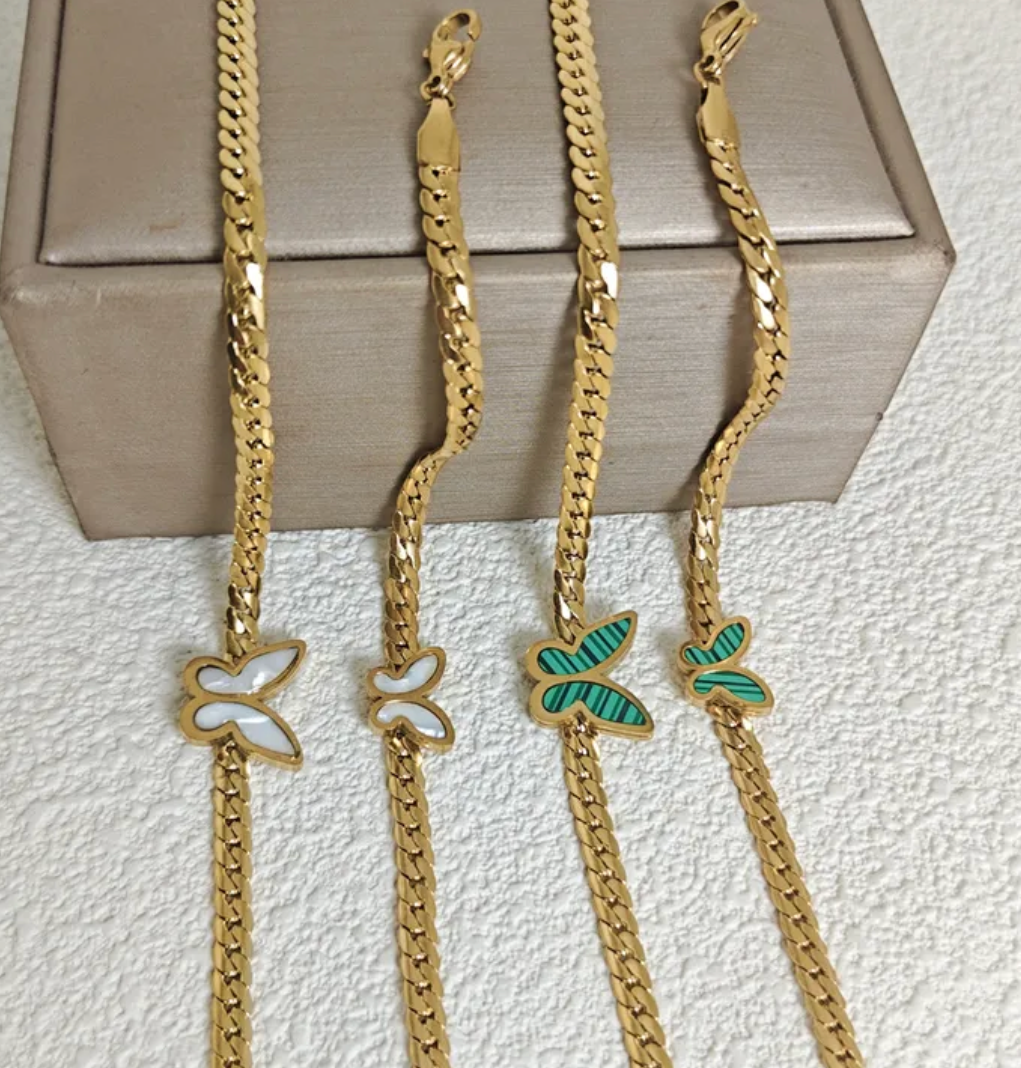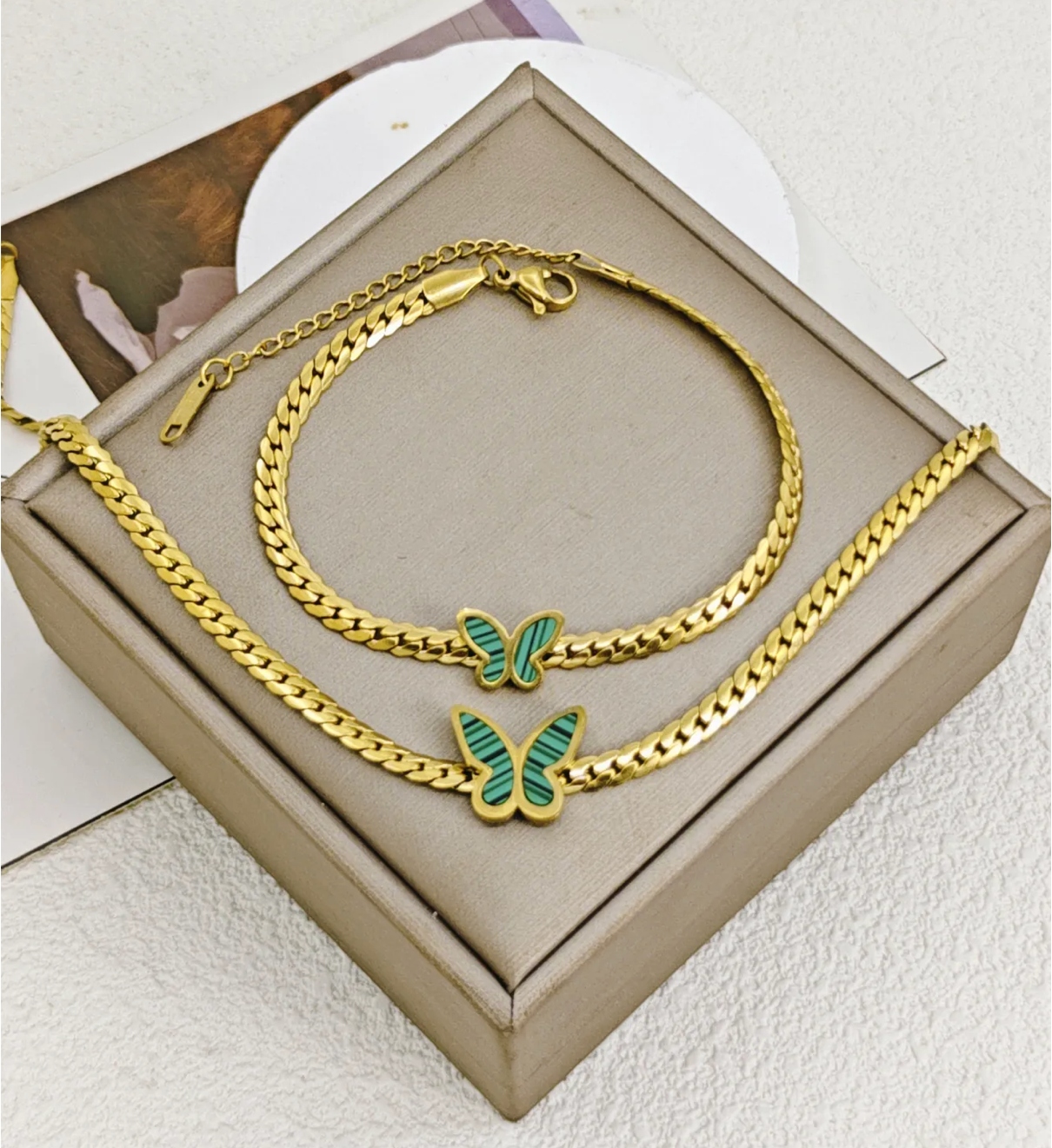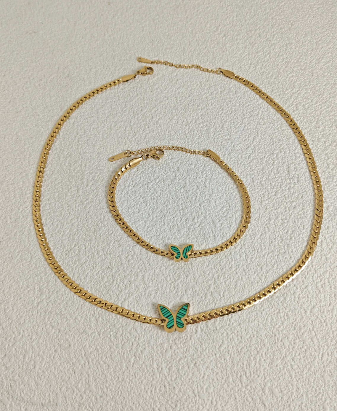 Delicate, elegant, and effortlessly stylish—the Green Golden Grace Butterfly Jewelry Set is a must-have for lovers of timeless beauty. This two-piece set, featuring a butterfly pendant necklace and matching bracelet, is crafted from high-quality 304 stainless steel with a stunning inlay design for a polished, sophisticated finish. Whether you’re dressing up for a special occasion or adding a subtle, feminine touch to your daily outfit, this set is the perfect balance of simplicity and elegance.