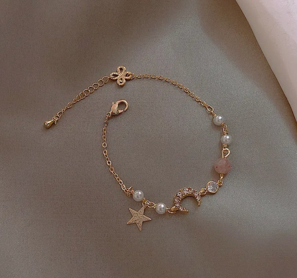 Add a touch of celestial elegance to your jewelry collection with the Moonlit Dreams Star & Moon Bracelet. This delicate yet luxurious piece features a beautiful pink jade charm, complemented by sparkling rhinestones and star and moon accents, symbolizing dreams, luck, and timeless beauty. Crafted from high-quality alloy with plating inlay, this bracelet offers a radiant shine and a lightweight, comfortable fit. Perfect for daily wear, special occasions, or as a thoughtful gift, itβs a must-have for anyone who loves feminine and dreamy accessories.