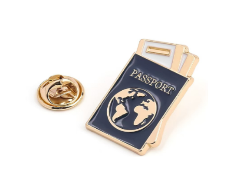A sleek and stylish pin featuring a navy-blue passport with gold detailing, symbolizing the love for travel and adventure. The embossed world map design adds an elegant touch, making it perfect for jet-setters, travel enthusiasts, or anyone with a passion for exploring new places.