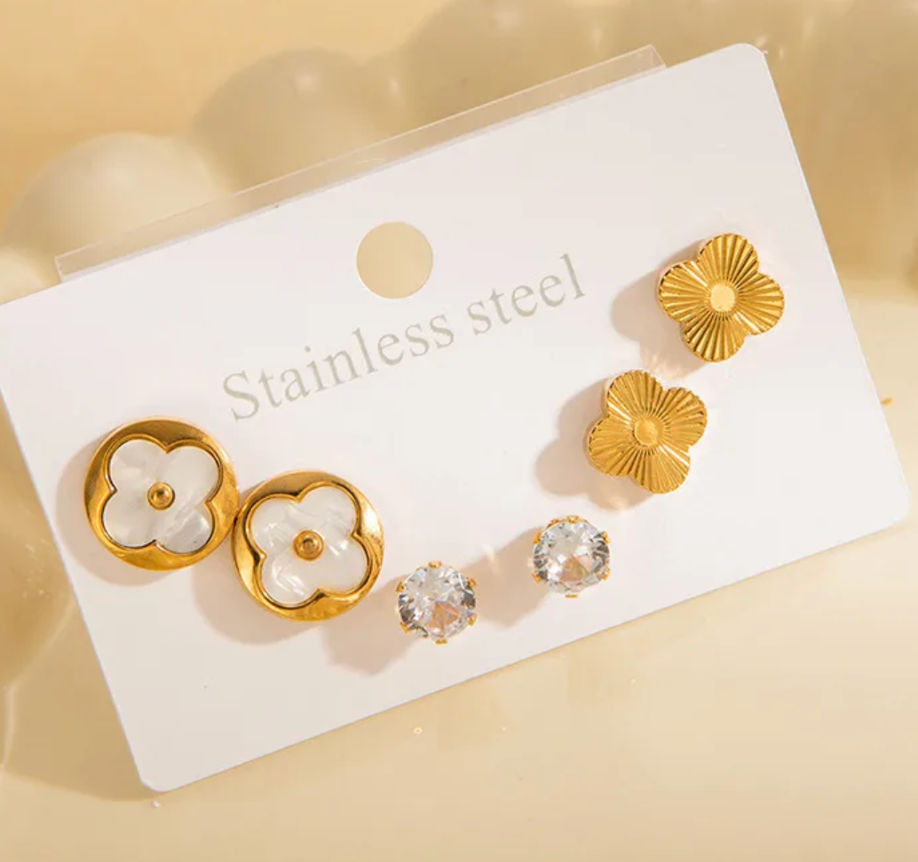 Indulge in timeless elegance with the Trio Luxe Clover Zircon Stud Set, featuring three pairs of exquisite four-leaf clover stud earrings. Designed for those who love refined luxury, each pair showcases brilliant zircon stones, set in a delicate yet bold design that radiates sophistication. Perfect for day-to-night styling, these earrings bring a touch of luck and high-end glamour to any outfit.